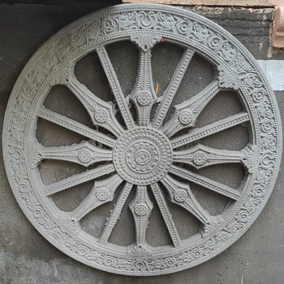 This kind of decorative piece is often found in temples, monuments (like Sanchi or Sarnath in India), or used as a cultural and religious symbol. It also appears in the national emblem of India as the Ashoka Chakra (with 24 spokes).